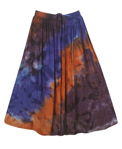 Tie dye distressed skirt has an elastic pull on waist with skinny tie. Skirt has matching half liner. Tie dye skirts are unique. Colors and patterns may vary from the one pictured. Material: 100% rayon. Origin: Made in India. Cleaning:Machine Wash. Fit Guide:Size 1x measures: 42" waist, 56" hips.You will not be disappointed with