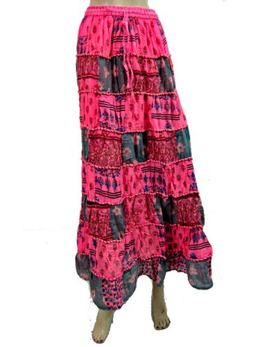 - This Hippie skirt made up of patchwork tiers constructed from a wide variety of recycled, new, vintage cotton prints in pink.