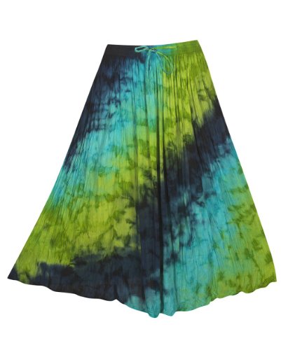 Tie dye distressed skirt has an elastic pull on waist with skinny tie. Skirt has matching half liner. Tie dye skirts are unique. Colors and patterns may vary from the one pictured. Material: 100% rayon. Origin: Made in India. Cleaning:Machine Wash. Fit Guide:Size 1x measures: 42" waist, 56" hips.You will not be disappointed with