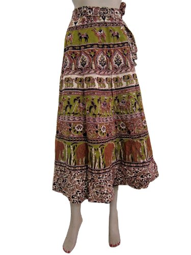 - olive green, brown and black colored cotton wrap skirt with eye-catching Elephant ,peacock and paisley print creates a tribal impression.