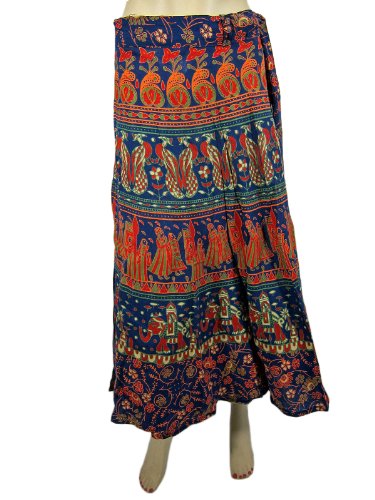 - Boho Style navy blue wrap skirt boasts traditional Indian motifs with elephants and peacock in rich shades of navy blue, tangerine orange and soft cream.
