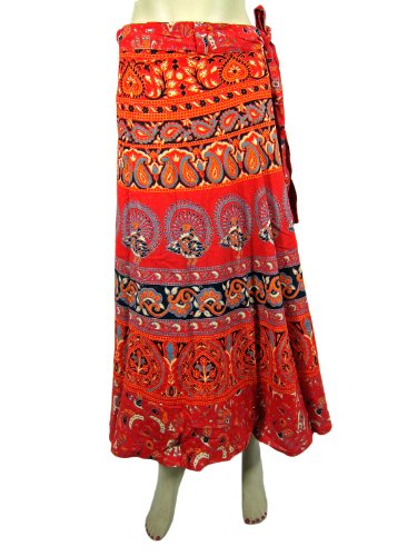 - Boho Style red wrap skirt boasts traditional Indian motifs with peacock and floral in rich shades of navy blue, tangerine orange and soft cream.